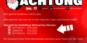 Sehr geehrte Kundinnen und Kunden, bitte beachten Sie, dass wir an den folgenden Tagen geschlossen haben: Übersicht der Schließtage Weihnachten/Silvester Mittwoch 24.12.2025 Samstag 27.12.2025 Mittwoch 31.12.2025 Wir wünschen Ihnen Frohe …
